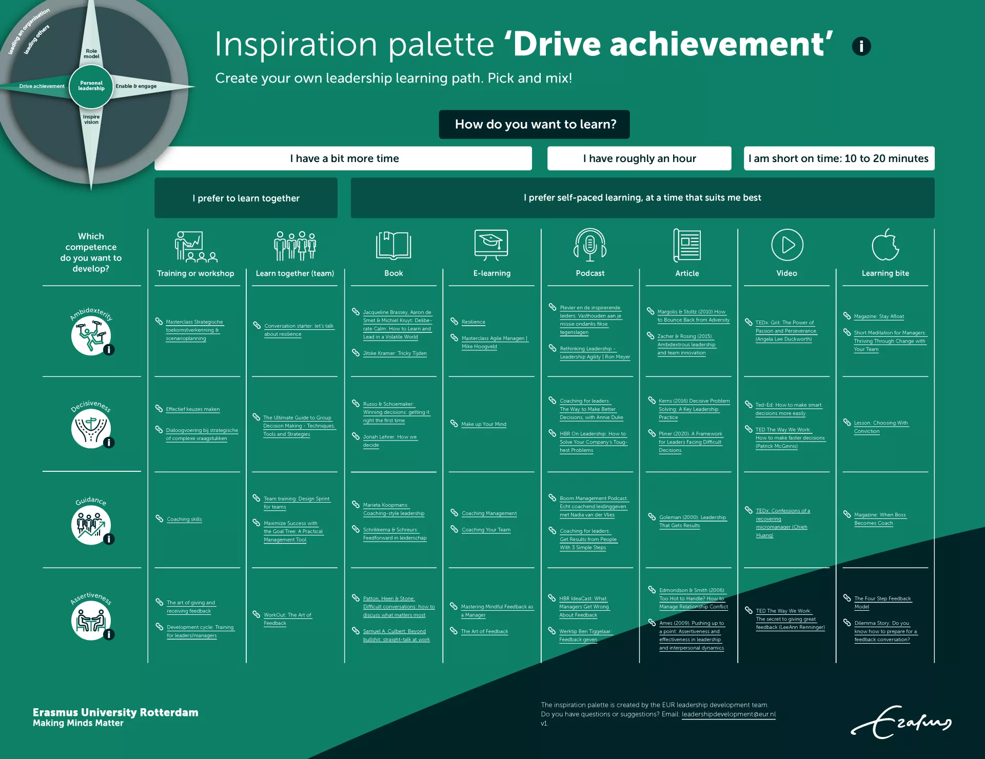 Ook was er een succesvolle pilot van een 360-graden feedback-tool voor leidinggevenden die in 2025 wordt opgenomen in de ontwikkelcyclus. Hiernaast werden vier inspiratiepaletten gemaakt op basis van de vier hoofdprincipes uit het EUR-leiderschapsprofiel. Deze inspiratiepaletten bevatten verschillende tools, bronnen en inspiratie voor het verder ontwikkelen van de verschillende sub-competenties uit het profiel.